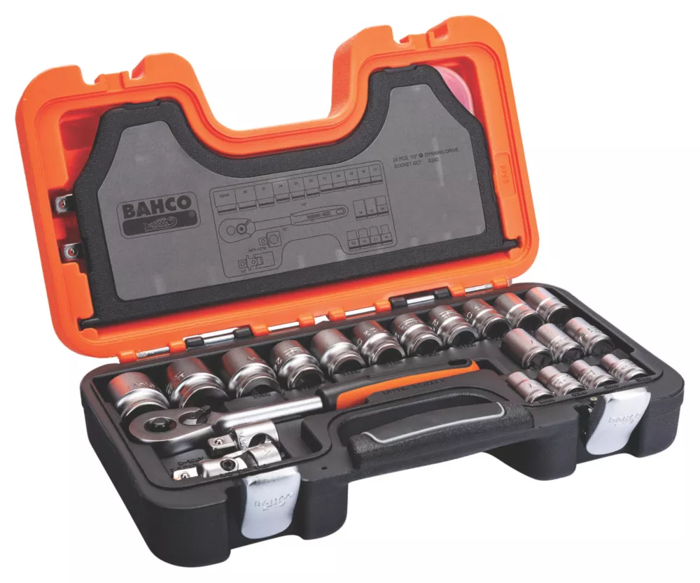 Dynamic drive socket profile for optimal grip. Durable full-metal locking device. 2-component ratchet handle for secure grip. Supplied in an impact-proof case made from high density polythene.