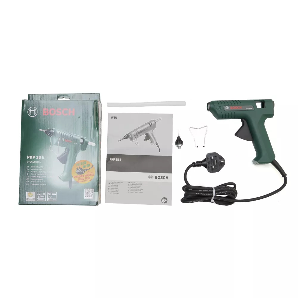 User-friendly glue gun with electronically regulated heating elements. Suitable for use on a variety of materials, including wood, plastic, ceramic, metal, glass, textiles and leather.