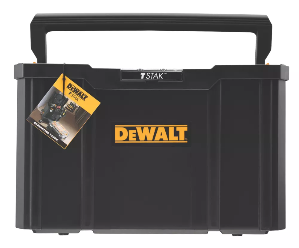 Plastic TSTAK tool tote with vertical tool storage for easy visibility and access. Folding carry handle and stacking latches as part of the TSTAK system. Nameplate for content identification.