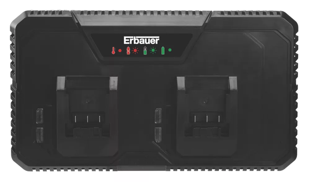 Charges two Erbauer 18V EXT or EXT EliteCell batteries simultaneously. Charges 2.0Ah EXT batteries in 30mins, 4.0Ah in 50mins and 5.0Ah in 60mins. Charges 4.0Ah EXT Elitecell batteries in 55mins. LED indicators communicate battery charge status. Part of the Erbauer 18V EXT one battery system, running multiple tools for increased flexibility.