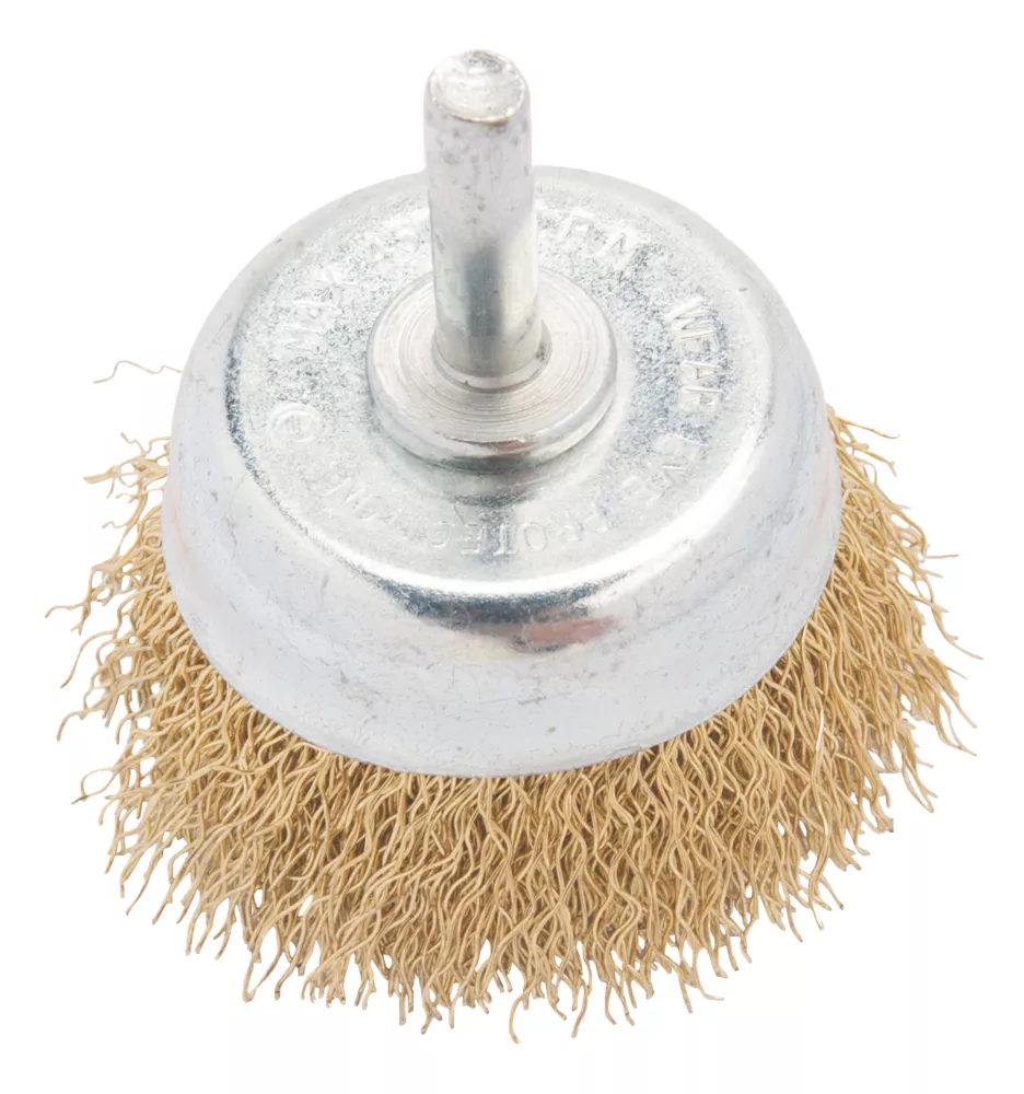 Steel crimped cup brush for rapid rust or paint removal and cleaning of metal and stone. Ideal for surface preparation. Can be used with most brands of drills.