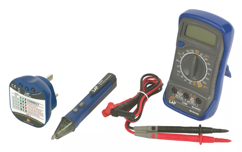 Practical and easy to use electrical detection triple pack, comprised of a compact non-contact AC voltage detector with sound and light instruction, socket tester for testing 14 wire conditions, with an LED indicator and digital multimeter with 2000 count LCD dislay and data hold facility.