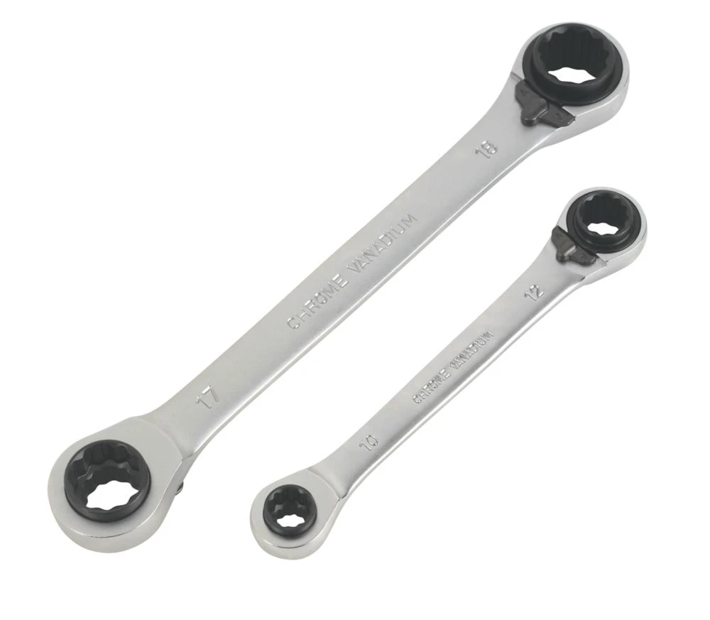 Ratchet spanner set equipped with a forward and reverse ratchet mechanism for speed, efficiency and ease of use. Hardened and chrome-plated for corrosion protection. Ideal for use in confined spaces.