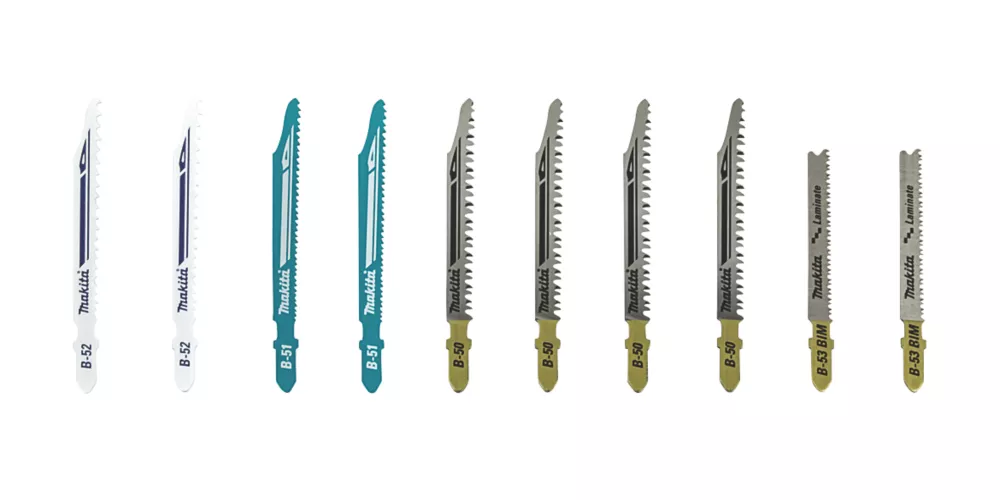 Assorted jigsaw blades that include Super Express blades for cutting various materials including wood and metal. Designed to produce superior cutting when used in a cordless jigsaw.
