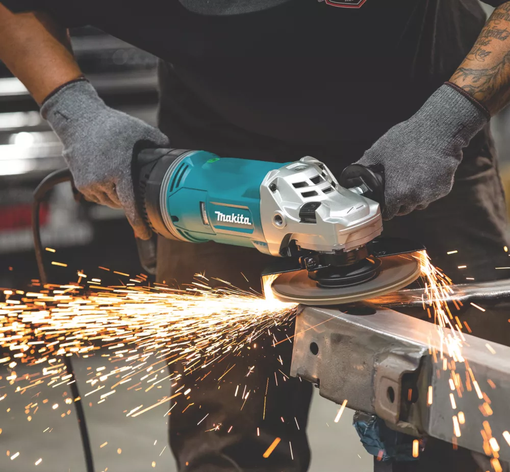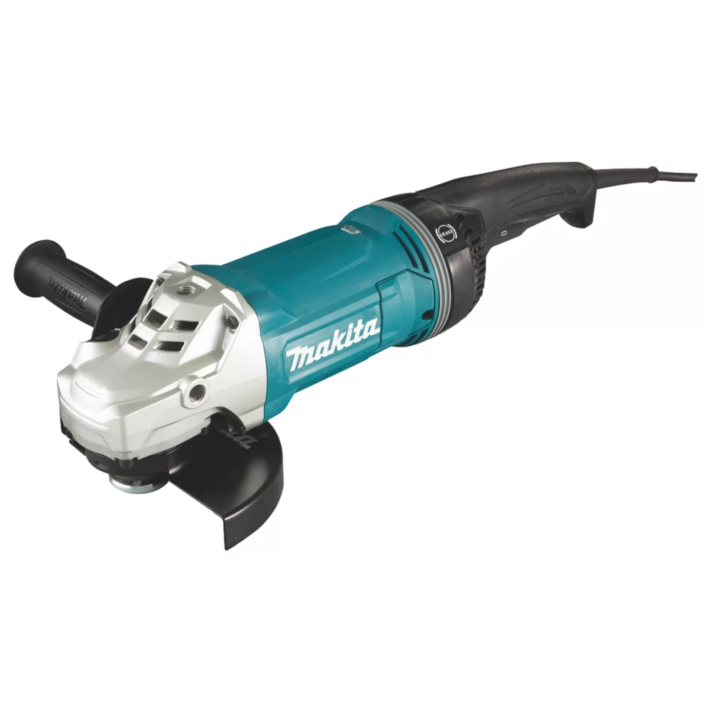 Ideal for heavy duty applications. Powerful motor and soft start for smooth start-ups and constant speed control to maintain constant speed under load. Features mechanical brake, large trigger switch with lever for lock-on and lock-off functions, anti-vibration housing and 3-position vibration-absorbing side grip. Rotatable, vibration-absorbing, straight main handle can be positioned to suit most cutting and grinding applications and gear housing can be positioned at every 90°. Also features large rubber tool rest, push-button spindle lock and anti-restart function to minimise accidental start-up. Double-insulated to protect the user from electric shock. Torque limiter and Active Feedback Sensing Technology (AFT) automatically shuts down the motor if rotation speed slows or wheel stops. Wheel cover protects from accidental scattering of broken wheel or workpiece.