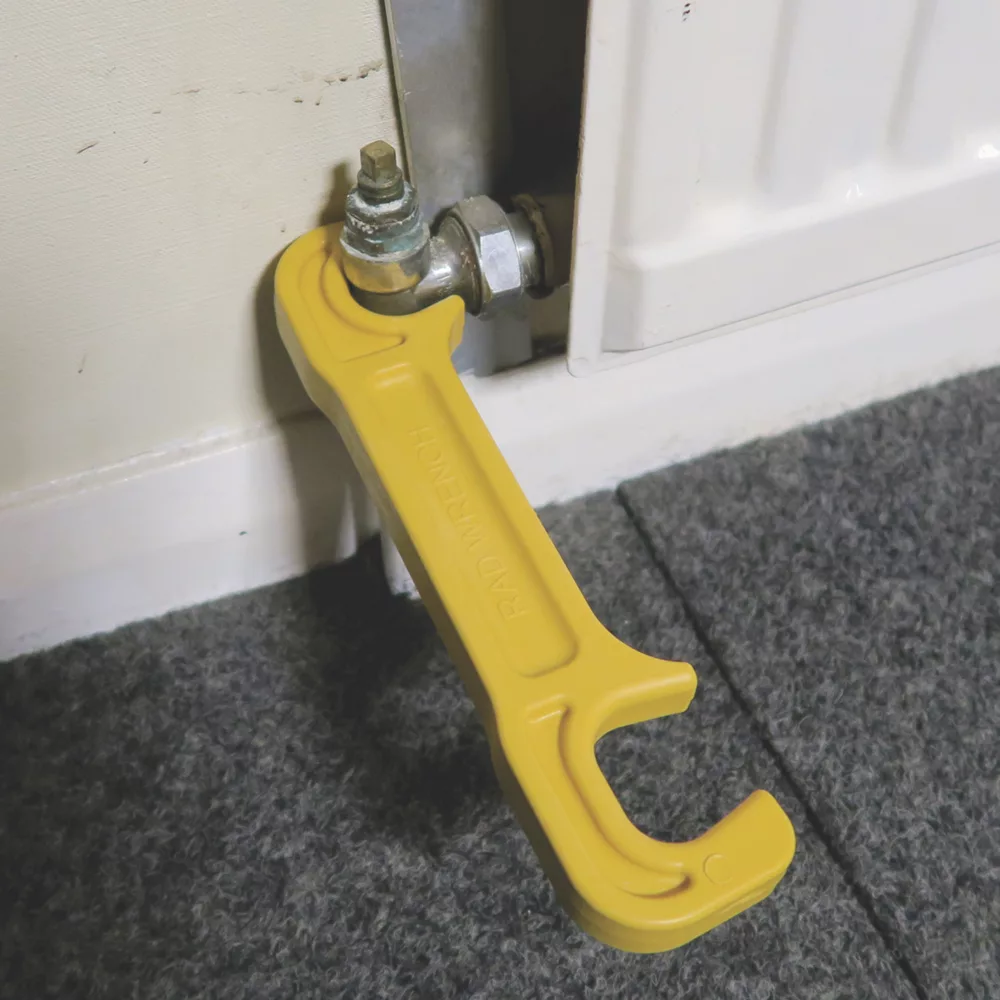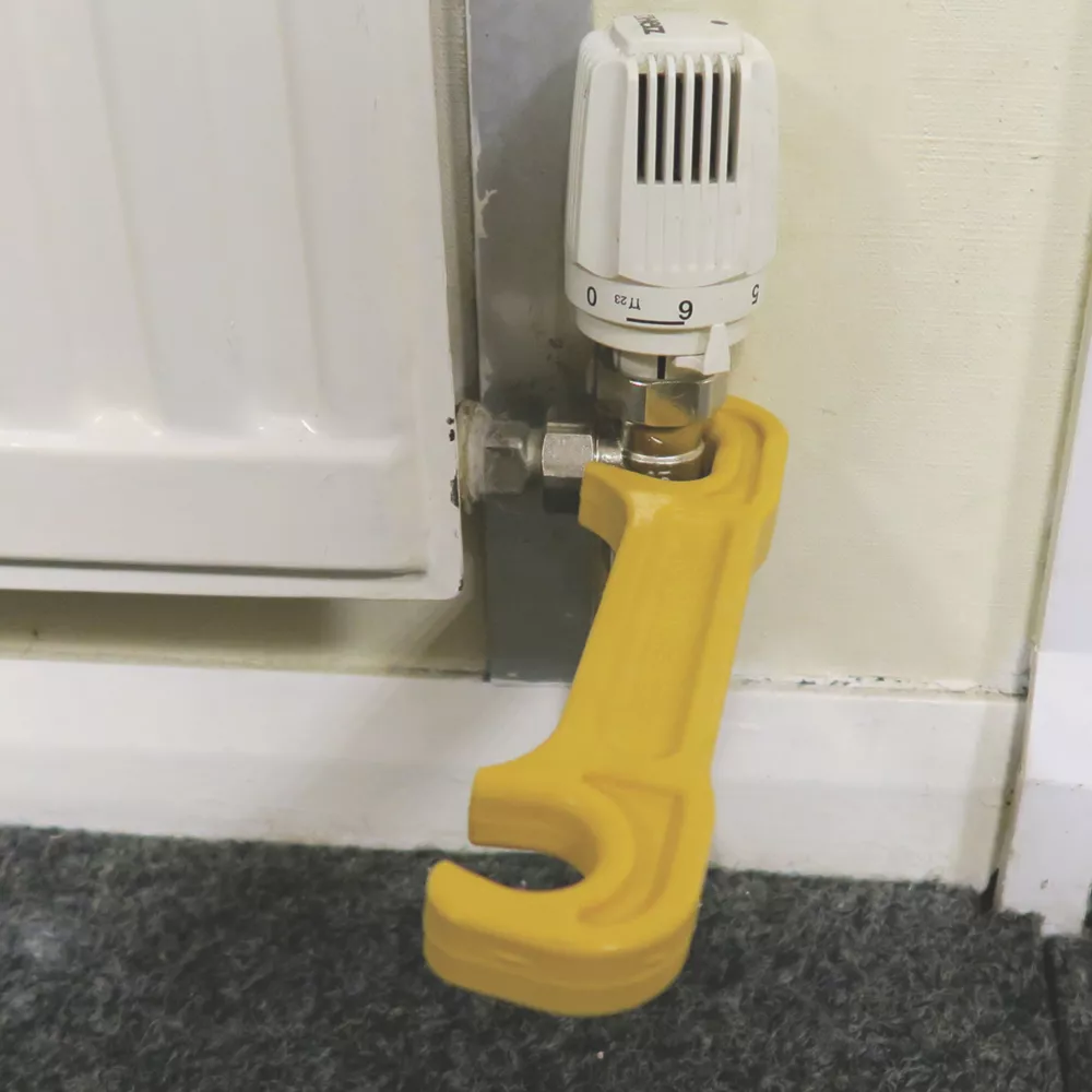 Radiator valve lever designed to facilitate the easy fitting and removal of standard and thermostatic radiator valves. Dual shaped ends fit around the valves and hold the valve in position. Perfect for use when water pump pliers or an adjustable wrench would mark or damage the pipe.