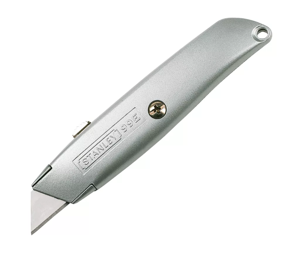 Retractable knife with 155mm die-cast body and multi-position sliding blade. Shaped for comfort. Blade storage in handle. Supplied with 3 trimming blades. For spare blades (Code 77082). Takes trimming, hooked, angled, concave, convex and laminate blades.