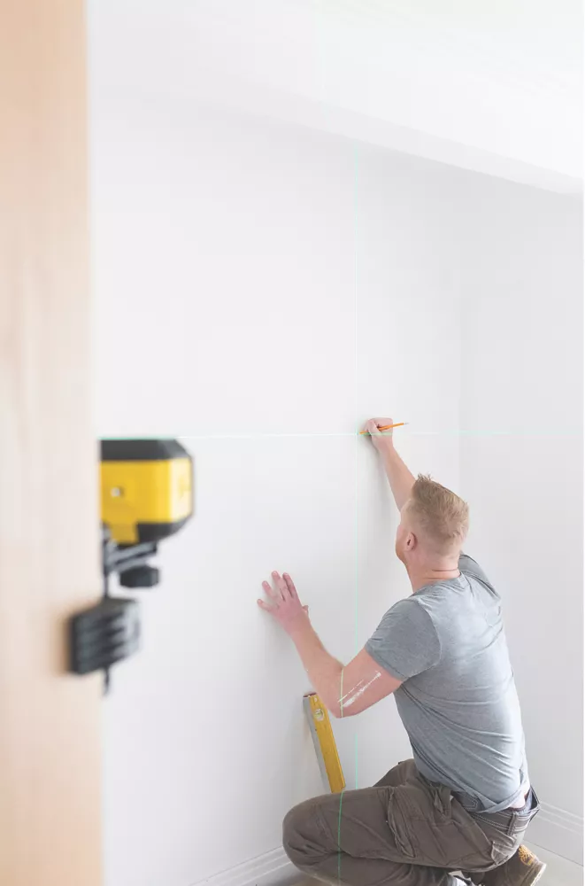 Green beam cross line laser level for DIY and light residential construction jobs. Projects 100° vertical line and horizontal lines. Supplied with locking pendulum, 3-position lock switch and removable quick link bracket. Also features ¼” thread mount for tripod usage and touchpad control panel. Supplied in a belt pouch. IP51 rated.
