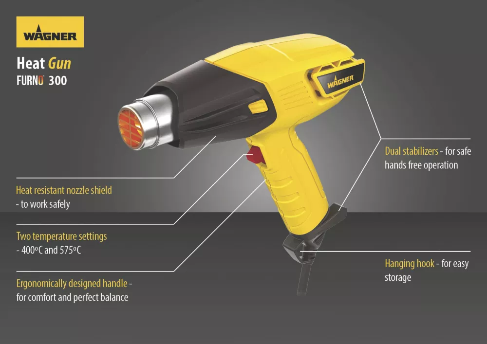 Ideally suited for first time users, small projects or light work in and around the home. Safe and effective alternative to using a blow torch. With 2 temperature settings of 400°C and 575°C to accomplish a range of tasks. Features an ergonomically designed handle for perfect balance and comfort. Safety features include a thermal cut-out and a heat shield with side fins to prevent the hot nozzle from touching surfaces. The nozzle is corrosion-resistant and features a heat-resistant cover. Dual stabilisers for safe hands-free operation and a hanging hook for easy storage.
