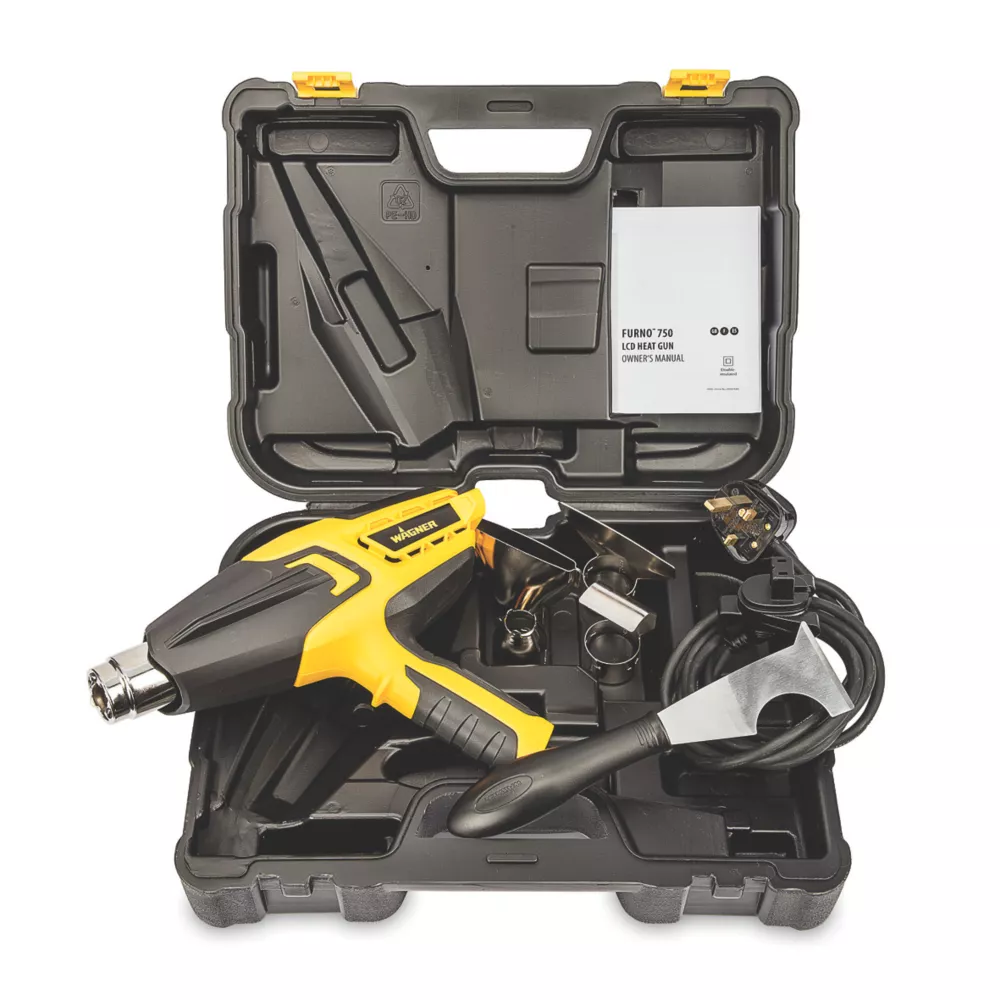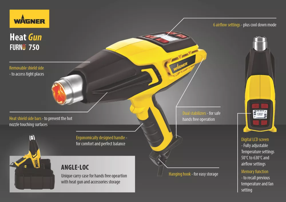 Professional electronic heat gun for stripping paint, bending pipes, heat shrinking and much more. Features LCD digital display with fully adjustable temperature range. Offers memory function for last temperature recall. 6-air flow settings and a ‘cool down’ mode help to prolong heater element’s life. Thermal protection sensors regulate the heat, while a heat-resistant nozzle cover with side fins prevents hot nozzle from touching surfaces. Ergonomic design with soft grip handle for maximum user comfort. Dual stabilisers and an angle-lock feature on blow-moulded carry case ensure safe hands-free operation. Easy to store with hanging hook.