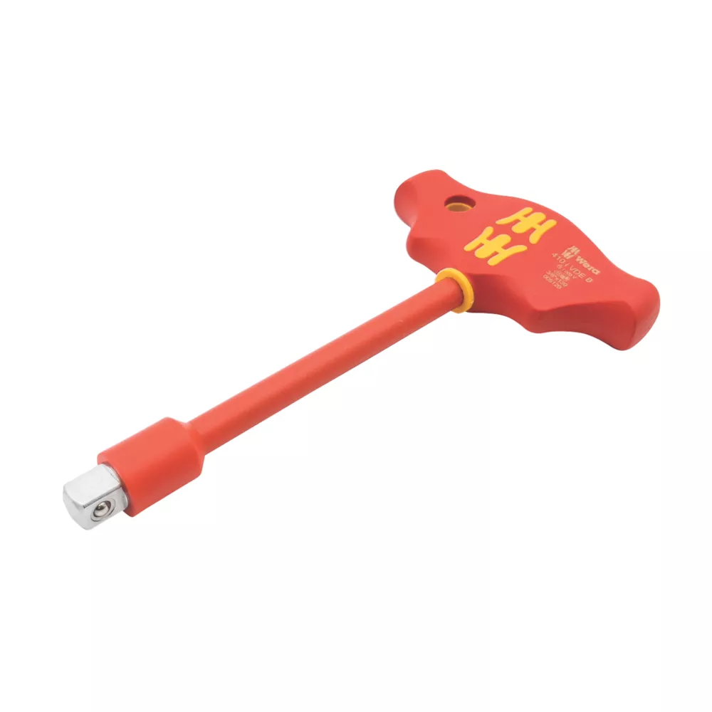 Ergonomic T-handle offers high tightening and loosening torque and fatigue-free working, with coating to protect sensitive surfaces from damage. Only allowed for â…œ” VDE bit sockets and sockets in the Wera Zyklop VDE series 8740, 8760, 8767 and 8790.