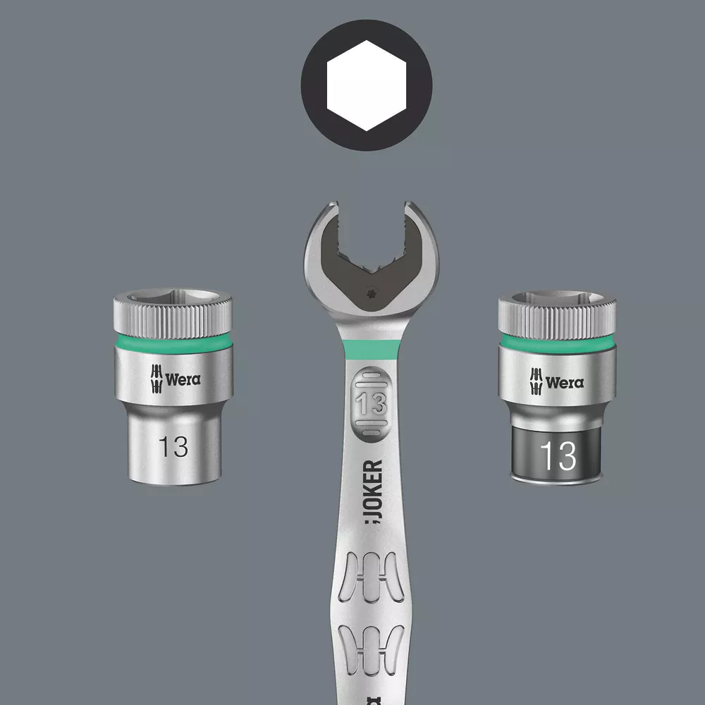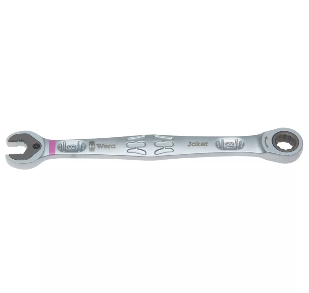 Combination ratchet spanner with holding function, limit stop, 30° return angle, anti-slip reinforced jaw and an ultra-fine high torque ratchet end. Holding function, with metal plate in the jaw, eliminates the risk of dropping nuts and bolts. Fastening on the thread can then be done quickly and safely. Double-hex geometry provides a positive connection onto nuts and bolts. Both the double-hex geometry, and straight-head design, work in synchronisation to halve the return angle from 60 to 30°. On the ratchet end, an 80 fine-tooth ratchet mechanism provides greater flexibility.