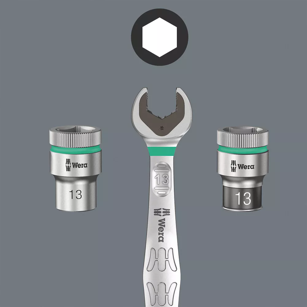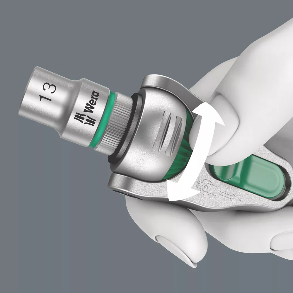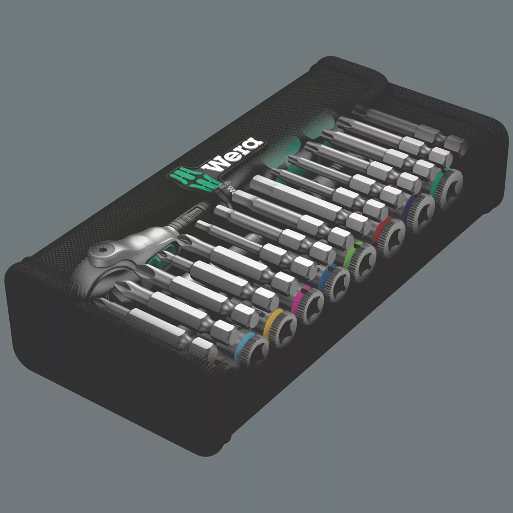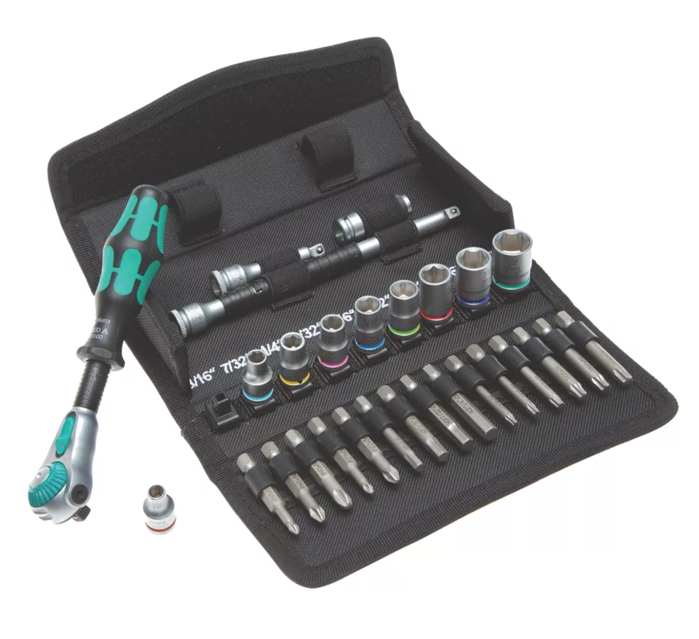 Wera 28 piece imperial compact Zyklop speed socket set, stored in an extremely robust textile case, ideal for those on the move. Includes the outstanding Zyklop Speed ratchet. Kraftform handle fits perfectly into the hand. Handle hard materials ensure quick and easy hand repositioning, whilst softer gripping zones ensure high torque transfer and comfort during intensive use. Rotation-symmetric structure of the Kraftform handle and the rapid spin free-turning sleeve ensure high working speeds. Ratchet head pivots freely and can be locked into any position using the slide switch positioned on either side of the ratchet. Predefined locking at 0° allows for the ratchet to be used as a conventional screwdriver by attaching a bit holder adaptor and a bit. Additional locking points at 15 and 90°, both to the left and right, ensure safe working without any slipping of the ratchet head. Impressive reversible ratchet mechanism with 72 fine-pitched teeth, allows for a short return angle of only 5°. Zyklop speed ratchets feature a thumbwheel that can be used to quickly to switch between clockwise and anti-clockwise rotation. Ball lock mechanism holds sockets securely, ensuring safe working at all times. To release and change sockets, simply press the release button on the back of the ratchet head. Wera sockets are made out of high-grade chrome vanadium for a long service life. Concave design allows for a greater fit in the socket and prevents any rounding out from occurring.